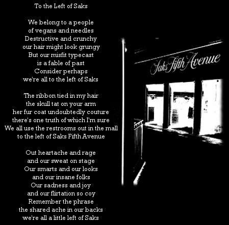 Posted in poetry To the Left of Saks Image• Posted on April 5, 2013May 24, 2013 by SHE'S IN PRISON Share this: Click to share on X (Opens in new window) X Click to share on Facebook (Opens in new window) Facebook Click to email a link to a friend (Opens in new window) Email Click to share on Pinterest (Opens in new window) Pinterest Click to print (Opens in new window) Print More Click to share on Tumblr (Opens in new window) Tumblr Click to share on LinkedIn (Opens in new window) LinkedIn Click to share on Reddit (Opens in new window) Reddit Click to share on Pocket (Opens in new window) Pocket Like Loading... Author: SHE'S IN PRISON Poetry and music. View All Posts