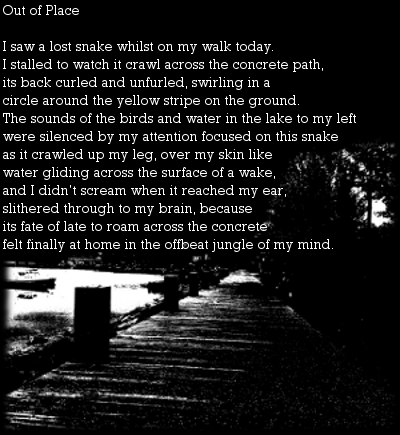 Posted in poetry Out of Place Image• Posted on April 9, 2013May 24, 2013 by SHE'S IN PRISON Share this: Click to share on X (Opens in new window) X Click to share on Facebook (Opens in new window) Facebook Click to email a link to a friend (Opens in new window) Email Click to share on Pinterest (Opens in new window) Pinterest Click to print (Opens in new window) Print More Click to share on Tumblr (Opens in new window) Tumblr Click to share on LinkedIn (Opens in new window) LinkedIn Click to share on Reddit (Opens in new window) Reddit Click to share on Pocket (Opens in new window) Pocket Like Loading... Author: SHE'S IN PRISON Poetry and music. View All Posts