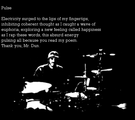 Posted in Josh Dun Poetry Corner, poetry Pulse Image• Posted on April 12, 2013May 24, 2013 by SHE'S IN PRISON Share this: Click to share on X (Opens in new window) X Click to share on Facebook (Opens in new window) Facebook Click to email a link to a friend (Opens in new window) Email Click to share on Pinterest (Opens in new window) Pinterest Click to print (Opens in new window) Print More Click to share on Tumblr (Opens in new window) Tumblr Click to share on LinkedIn (Opens in new window) LinkedIn Click to share on Reddit (Opens in new window) Reddit Click to share on Pocket (Opens in new window) Pocket Like Loading... Author: SHE'S IN PRISON Poetry and music. View All Posts