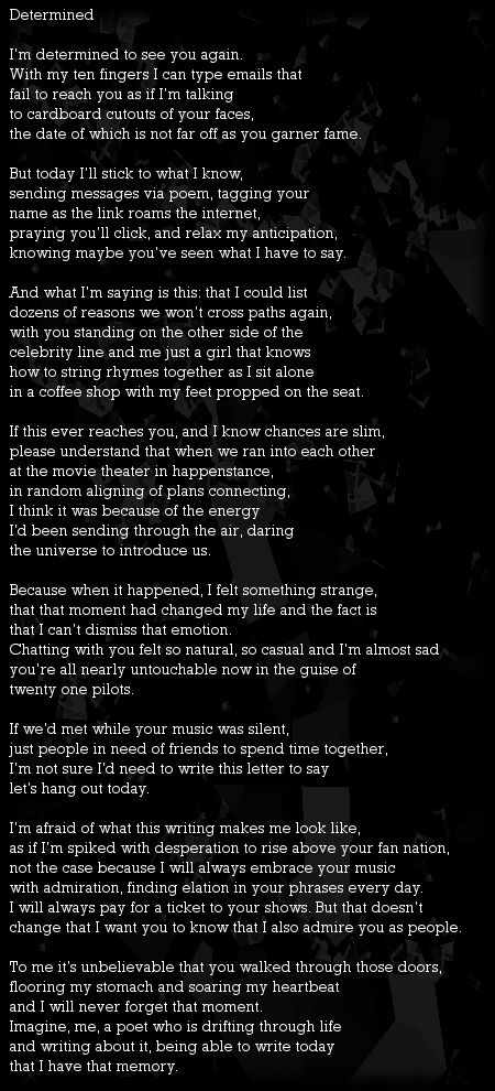 Posted in poetry Determined Image• Posted on April 18, 2013May 24, 2013 by SHE'S IN PRISON Share this: Click to share on X (Opens in new window) X Click to share on Facebook (Opens in new window) Facebook Click to email a link to a friend (Opens in new window) Email Click to share on Pinterest (Opens in new window) Pinterest Click to print (Opens in new window) Print More Click to share on Tumblr (Opens in new window) Tumblr Click to share on LinkedIn (Opens in new window) LinkedIn Click to share on Reddit (Opens in new window) Reddit Click to share on Pocket (Opens in new window) Pocket Like Loading... Author: SHE'S IN PRISON Poetry and music. View All Posts