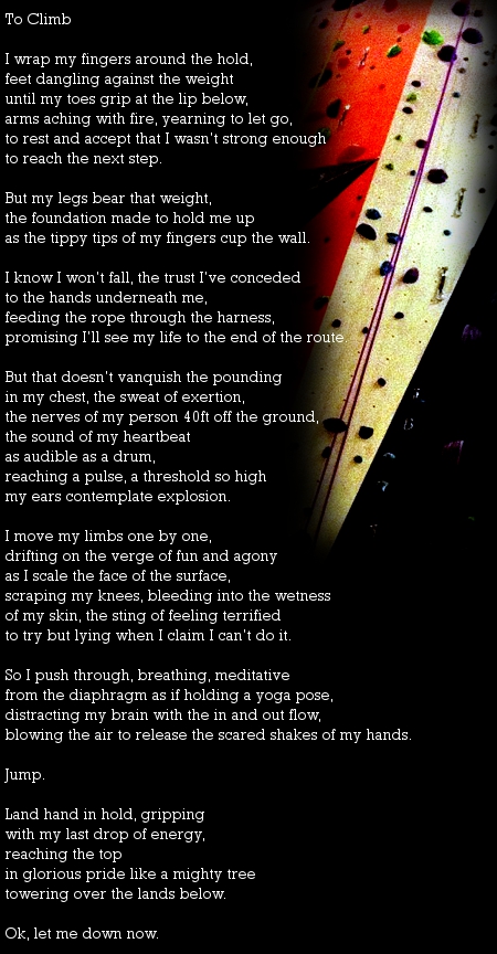 Posted in poetry To Climb Image• Posted on April 30, 2013May 24, 2013 by SHE'S IN PRISON Share this: Click to share on X (Opens in new window) X Click to share on Facebook (Opens in new window) Facebook Click to email a link to a friend (Opens in new window) Email Click to share on Pinterest (Opens in new window) Pinterest Click to print (Opens in new window) Print More Click to share on Tumblr (Opens in new window) Tumblr Click to share on LinkedIn (Opens in new window) LinkedIn Click to share on Reddit (Opens in new window) Reddit Click to share on Pocket (Opens in new window) Pocket Like Loading... Author: SHE'S IN PRISON Poetry and music. View All Posts