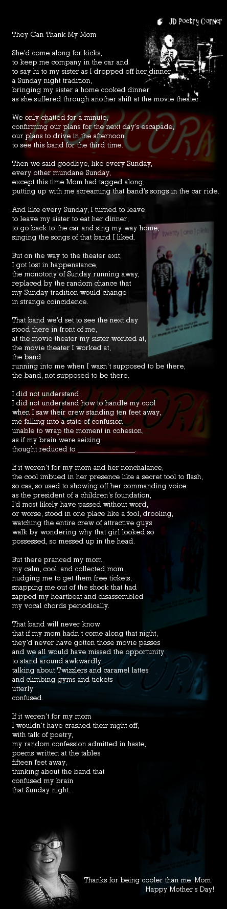 Posted in Josh Dun Poetry Corner, poetry They Can Thank My Mom Image• Posted on May 12, 2013May 24, 2013 by SHE'S IN PRISON Share this: Click to share on X (Opens in new window) X Click to share on Facebook (Opens in new window) Facebook Click to email a link to a friend (Opens in new window) Email Click to share on Pinterest (Opens in new window) Pinterest Click to print (Opens in new window) Print More Click to share on Tumblr (Opens in new window) Tumblr Click to share on LinkedIn (Opens in new window) LinkedIn Click to share on Reddit (Opens in new window) Reddit Click to share on Pocket (Opens in new window) Pocket Like Loading... Author: SHE'S IN PRISON Poetry and music. View All Posts