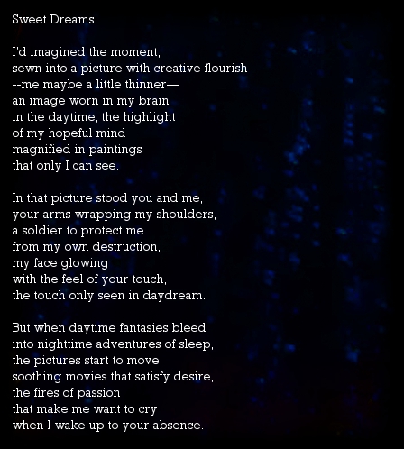 Posted in poetry Sweet Dreams Image• Posted on May 18, 2013May 24, 2013 by SHE'S IN PRISON Share this: Click to share on X (Opens in new window) X Click to share on Facebook (Opens in new window) Facebook Click to email a link to a friend (Opens in new window) Email Click to share on Pinterest (Opens in new window) Pinterest Click to print (Opens in new window) Print More Click to share on Tumblr (Opens in new window) Tumblr Click to share on LinkedIn (Opens in new window) LinkedIn Click to share on Reddit (Opens in new window) Reddit Click to share on Pocket (Opens in new window) Pocket Like Loading... Author: SHE'S IN PRISON Poetry and music. View All Posts