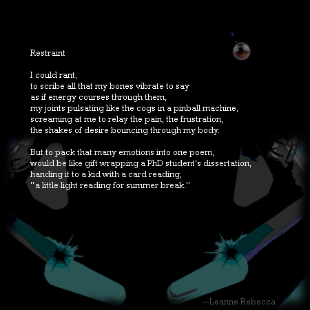 Posted in poetry Restraint Image• Posted on June 7, 2013 by SHE'S IN PRISON Share this: Click to share on X (Opens in new window) X Click to share on Facebook (Opens in new window) Facebook Click to email a link to a friend (Opens in new window) Email Click to share on Pinterest (Opens in new window) Pinterest Click to print (Opens in new window) Print More Click to share on Tumblr (Opens in new window) Tumblr Click to share on LinkedIn (Opens in new window) LinkedIn Click to share on Reddit (Opens in new window) Reddit Click to share on Pocket (Opens in new window) Pocket Like Loading... Author: SHE'S IN PRISON Poetry and music. View All Posts