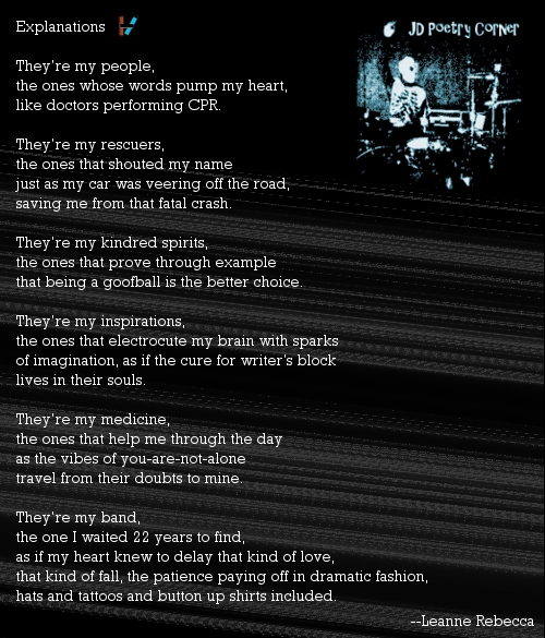 Posted in Josh Dun Poetry Corner, Music, poetry, twenty one pilots Explanations Image• Posted on June 30, 2013 by SHE'S IN PRISON Share this: Click to share on X (Opens in new window) X Click to share on Facebook (Opens in new window) Facebook Click to email a link to a friend (Opens in new window) Email Click to share on Pinterest (Opens in new window) Pinterest Click to print (Opens in new window) Print More Click to share on Tumblr (Opens in new window) Tumblr Click to share on LinkedIn (Opens in new window) LinkedIn Click to share on Reddit (Opens in new window) Reddit Click to share on Pocket (Opens in new window) Pocket Like Loading... Author: SHE'S IN PRISON Poetry and music. View All Posts