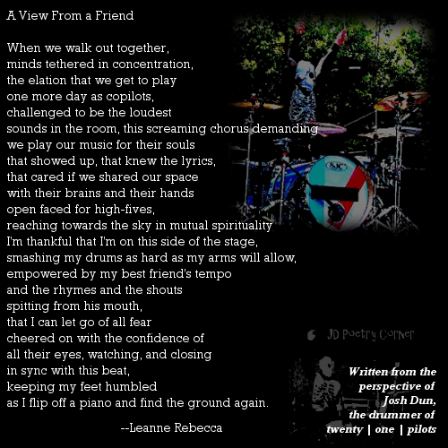 Posted in Josh Dun Poetry Corner, Music, poetry, twenty one pilots A View From a Friend Image• Posted on July 21, 2013 by SHE'S IN PRISON Share this: Click to share on X (Opens in new window) X Click to share on Facebook (Opens in new window) Facebook Click to email a link to a friend (Opens in new window) Email Click to share on Pinterest (Opens in new window) Pinterest Click to print (Opens in new window) Print More Click to share on Tumblr (Opens in new window) Tumblr Click to share on LinkedIn (Opens in new window) LinkedIn Click to share on Reddit (Opens in new window) Reddit Click to share on Pocket (Opens in new window) Pocket Like Loading... Author: SHE'S IN PRISON Poetry and music. View All Posts
