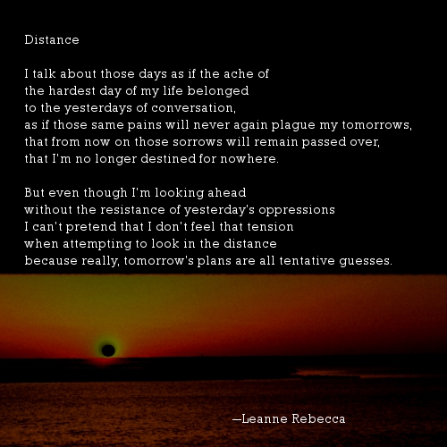 Posted in poetry, writing Distance Image• Posted on July 31, 2013 by SHE'S IN PRISON Share this: Click to share on X (Opens in new window) X Click to share on Facebook (Opens in new window) Facebook Click to email a link to a friend (Opens in new window) Email Click to share on Pinterest (Opens in new window) Pinterest Click to print (Opens in new window) Print More Click to share on Tumblr (Opens in new window) Tumblr Click to share on LinkedIn (Opens in new window) LinkedIn Click to share on Reddit (Opens in new window) Reddit Click to share on Pocket (Opens in new window) Pocket Like Loading... Author: SHE'S IN PRISON Poetry and music. View All Posts