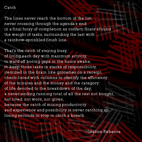 Posted in poetry, writing Catch Image• Posted on August 14, 2013 by SHE'S IN PRISON Share this: Click to share on X (Opens in new window) X Click to share on Facebook (Opens in new window) Facebook Click to email a link to a friend (Opens in new window) Email Click to share on Pinterest (Opens in new window) Pinterest Click to print (Opens in new window) Print More Click to share on Tumblr (Opens in new window) Tumblr Click to share on LinkedIn (Opens in new window) LinkedIn Click to share on Reddit (Opens in new window) Reddit Click to share on Pocket (Opens in new window) Pocket Like Loading... Author: SHE'S IN PRISON Poetry and music. View All Posts
