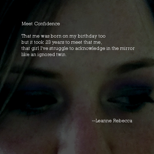 Posted in poetry, writing Meet Confidence Image• Posted on September 4, 2013 by SHE'S IN PRISON Share this: Click to share on X (Opens in new window) X Click to share on Facebook (Opens in new window) Facebook Click to email a link to a friend (Opens in new window) Email Click to share on Pinterest (Opens in new window) Pinterest Click to print (Opens in new window) Print More Click to share on Tumblr (Opens in new window) Tumblr Click to share on LinkedIn (Opens in new window) LinkedIn Click to share on Reddit (Opens in new window) Reddit Click to share on Pocket (Opens in new window) Pocket Like Loading... Author: SHE'S IN PRISON Poetry and music. View All Posts