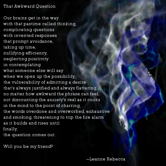 Posted in poetry, writing That Awkward Question Image• Posted on September 17, 2013 by SHE'S IN PRISON Share this: Click to share on X (Opens in new window) X Click to share on Facebook (Opens in new window) Facebook Click to email a link to a friend (Opens in new window) Email Click to share on Pinterest (Opens in new window) Pinterest Click to print (Opens in new window) Print More Click to share on Tumblr (Opens in new window) Tumblr Click to share on LinkedIn (Opens in new window) LinkedIn Click to share on Reddit (Opens in new window) Reddit Click to share on Pocket (Opens in new window) Pocket Like Loading... Author: SHE'S IN PRISON Poetry and music. View All Posts