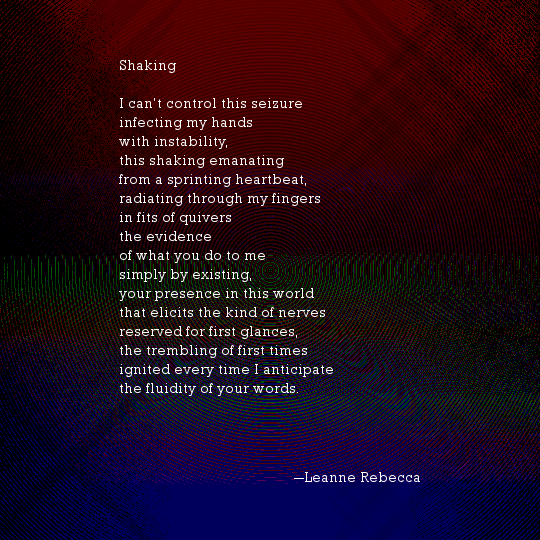 Posted in art, poetry, writing Shaking Image• Posted on December 11, 2013 by SHE'S IN PRISON Share this: Click to share on X (Opens in new window) X Click to share on Facebook (Opens in new window) Facebook Click to email a link to a friend (Opens in new window) Email Click to share on Pinterest (Opens in new window) Pinterest Click to print (Opens in new window) Print More Click to share on Tumblr (Opens in new window) Tumblr Click to share on LinkedIn (Opens in new window) LinkedIn Click to share on Reddit (Opens in new window) Reddit Click to share on Pocket (Opens in new window) Pocket Like Loading... Author: SHE'S IN PRISON Poetry and music. View All Posts