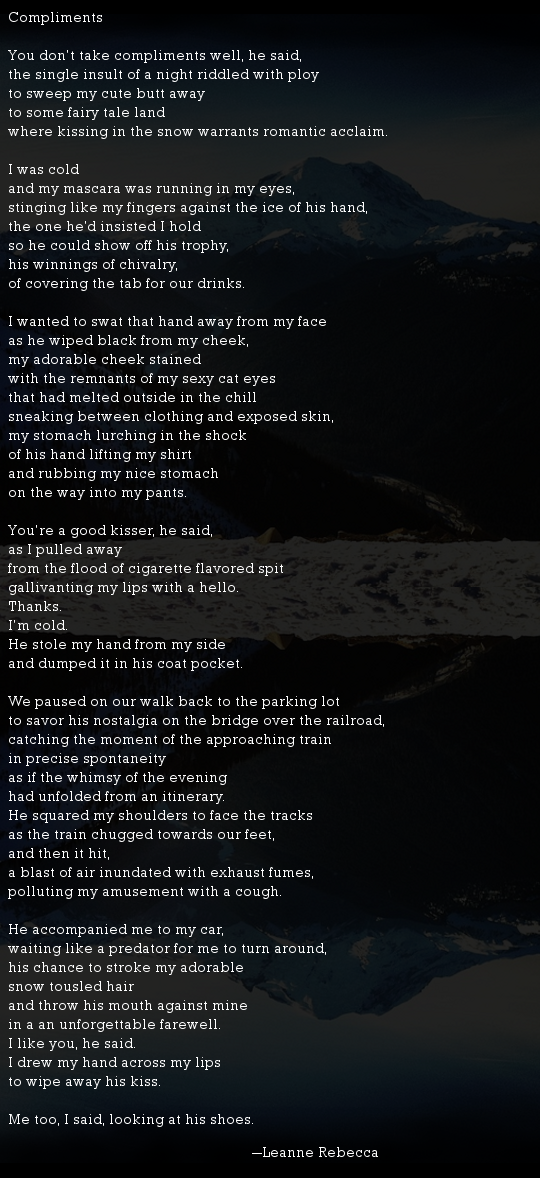 Posted in art, poetry, writing Compliments Image• Posted on January 24, 2014 by SHE'S IN PRISON Share this: Click to share on X (Opens in new window) X Click to share on Facebook (Opens in new window) Facebook Click to email a link to a friend (Opens in new window) Email Click to share on Pinterest (Opens in new window) Pinterest Click to print (Opens in new window) Print More Click to share on Tumblr (Opens in new window) Tumblr Click to share on LinkedIn (Opens in new window) LinkedIn Click to share on Reddit (Opens in new window) Reddit Click to share on Pocket (Opens in new window) Pocket Like Loading... Author: SHE'S IN PRISON Poetry and music. View All Posts