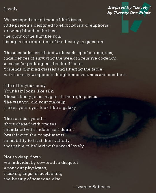 How do you make someone believe they’re lovely? More importantly, how do you make yourself believe that you are lovely? It’s a question that no one can answer for you but I encourage you to explore it. And in the meantime, check out the song “Lovely” by Twenty One Pilots below (it’s one of my favorites!) and peruse the archives of my other TOP inspired poetry HERE! Happy Saturday!