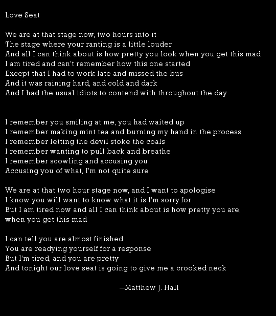 My name is Matthew J. Hall and I don’t have a degree nor own any cats. I am not studying creative writing and I am not the editor of any literary mags. I have worked in many factories and warehouses assembling, packing and picking everything from shoes to pornographic magazines. I am an avid reader and writer of poetry and short fiction. I aim to one day live a quiet life by a body of water with my wife, drinking whiskey, eating cheese and writing.