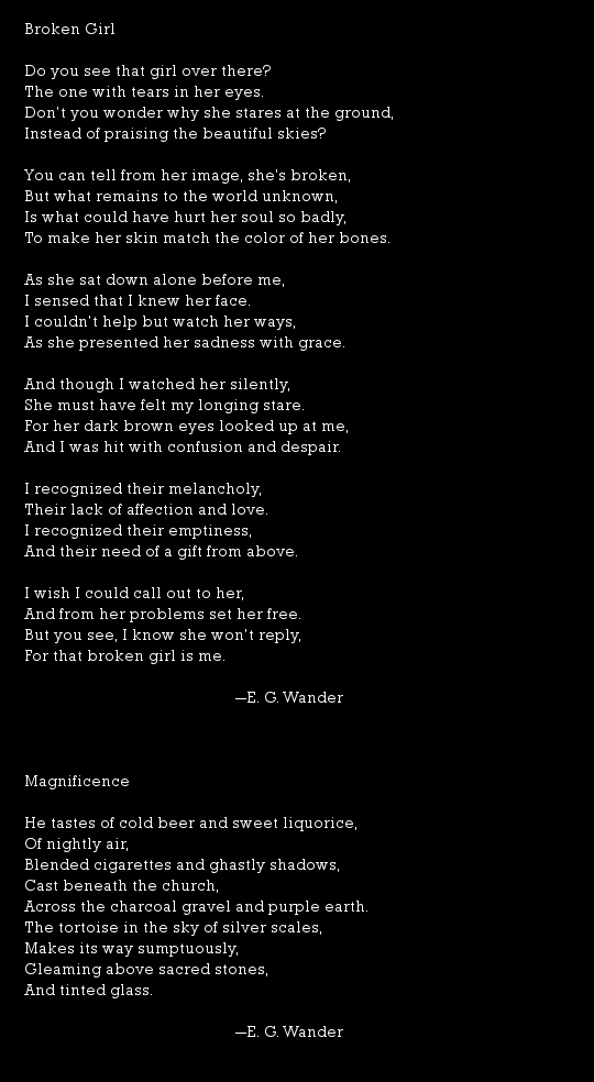 My name is Elianne El-Amyouni, and I write under the pen-name E. G. Wander. I’m 21 years old and spend my time playing the saxophone, singing, writing about the world around me, and wandering around aimlessly when I’m not in class. I was born in Halifax, Nova Scotia, but am currently living in Lebanon, and soon enough I’ll be graduated and roaming the world. Connect with Elianne on Facebook: https://www.facebook.com/lillo.ea