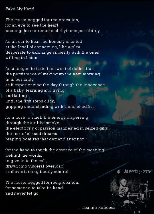 Last April I started the Josh Dun Poetry Corner purely for the fun of showcasing my admiration for the band Twenty One Pilots on my own creative platform. The Corner started after I sent Josh a poem via Twitter. I never expected he’d not only read the poem, but respond. Elated, I wrote another poem as a thank you to my favorite drummer for acknowledging my words, and again, I sent it to him. I felt shocked when he responded to that one too.