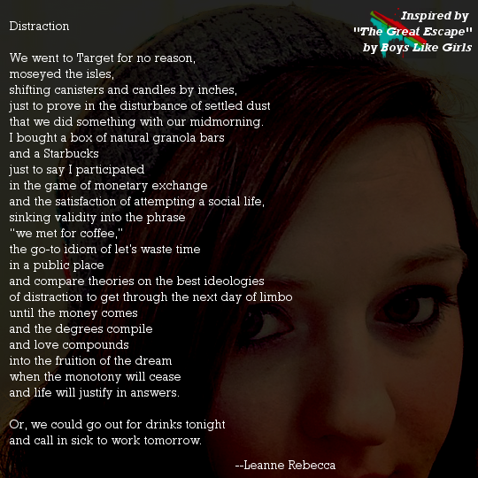 As per my usual Sunday series inspired by songs on my playlist, today’s poem is inspired by “The Great Escape,” by Boys Like Girls. I’ve been utterly obsessed with this song for about a month. Sure I heard it when it came out years ago, but rediscovering it has deepened my connection beyond the initial admiration of dancing along to a catchy song. Anyway, give a listen below and come back again next week for another round of celebrating the camaraderie of music and poetry.