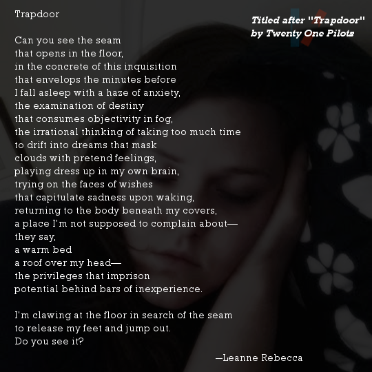 This poem is inspired by “Trapdoor” by Twenty One Pilots and per usual, I implore you to listen to their music. It’s no secret they’re my favorite band. You can check out the archives of my other pieces titled after their songs in my TOP archives page and come back next Saturday for another post in the series!