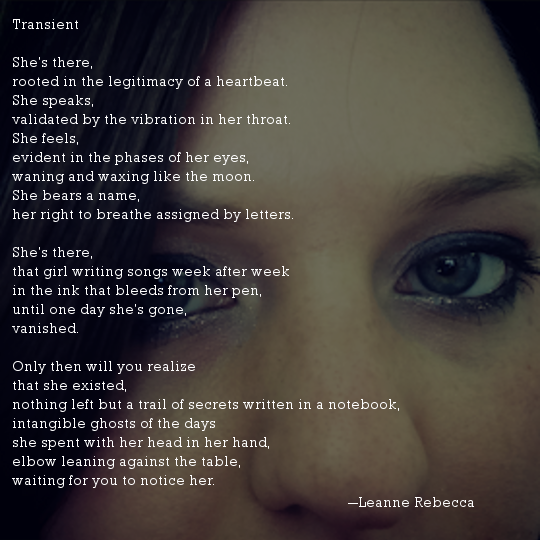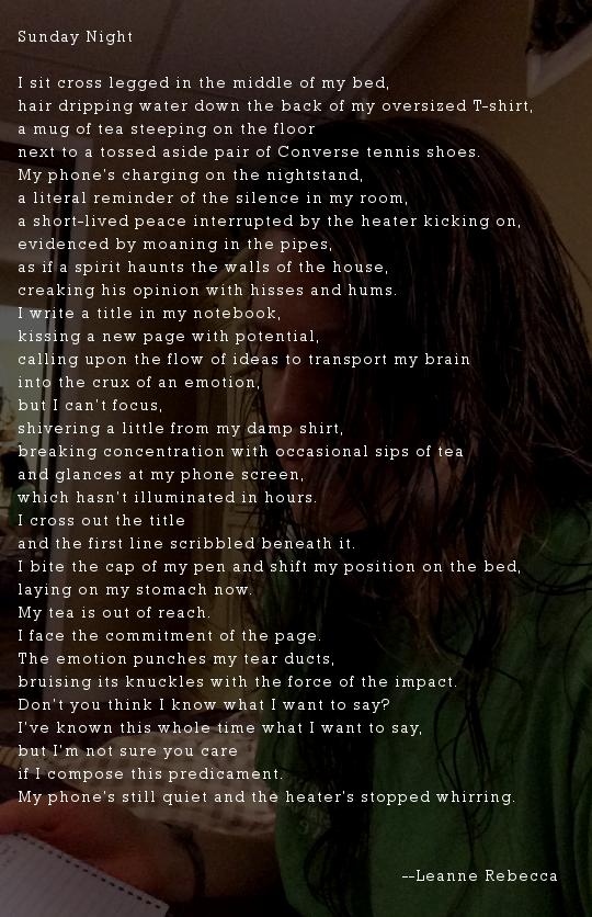 I think it’s important to notate that the rhyme in the last  lines is completely unintentional! The last step in my writing process always involves reading the poem out loud (which probably gives people the impression I’m talking to myself, especially if I’m in a coffee shop or something). Anyway, I didn’t notice the rhyme until that moment and in utter honesty, I liked the individual lines too much to change it. Deal with it.