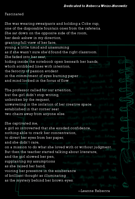 FascinatedMy friend Becca and I like to exchange writing prompts as a way to keep in touch (she lives on the east coast and I in the Midwest) and also to encourage each other to stretch our poetic muscles a bit. The last prompt was mine, and it proved a challenge, taking me a solid two weeks to produce. We were supposed to write about the first time we’d “met,” or in this case, the first time we saw each other. The prompt also came with a catch…it had to be the truth, regardless of what kind of light it placed the other person in. It’s been 5ish years since that fateful day, and I must say, she’s just as cool now as when she captivated me from across the room in our literary method class freshman year of college.