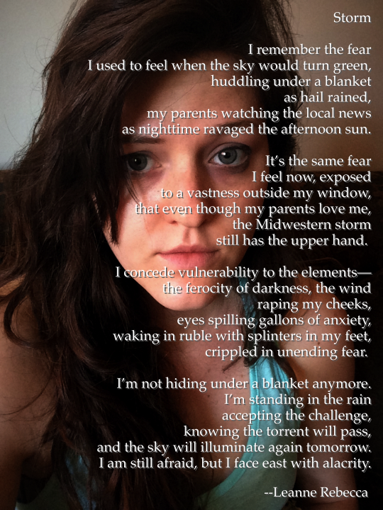 Storm  I remember the fear I used to feel when the sky would turn green, huddling under a blanket as hail rained, my parents watching the local news as nighttime ravaged the afternoon sun.  It’s the same fear I feel now, exposed to a vastness outside my window, that even though my parents love me, the Midwestern storm still has the upper hand.   I concede vulnerability to the elements— the ferocity of darkness, the wind raping my cheeks, eyes spilling gallons of anxiety, waking in ruble with splinters in my feet, crippled in unending fear.   I’m not hiding under a blanket anymore. I’m standing in the rain accepting the challenge, knowing the torrent will pass, and the sky will illuminate again tomorrow. I am still afraid, but I face east with alacrity.