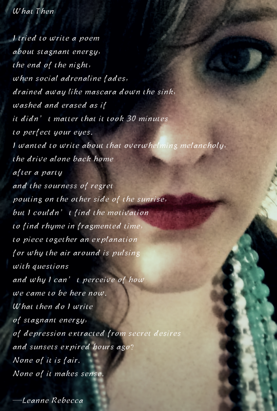 What Then  I tried to write a poem about stagnant energy, the end of the night, when social adrenaline fades, drained away like mascara down the sink, washed and erased as if  it didn’t matter that it took 30 minutes to perfect your eyes. I wanted to write about that overwhelming melancholy, the drive alone back home after a party and the sourness of regret pouting on the other side of the sunrise, but I couldn’t find the motivation to find rhyme in fragmented time, to piece together an explanation for why the air around is pulsing with questions and why I can’t perceive of how we came to be here now. What then do I write of stagnant energy, of depression extracted from secret desires and sunsets expired hours ago? None of it is fair.   None of it makes sense.   —Leanne Rebecca